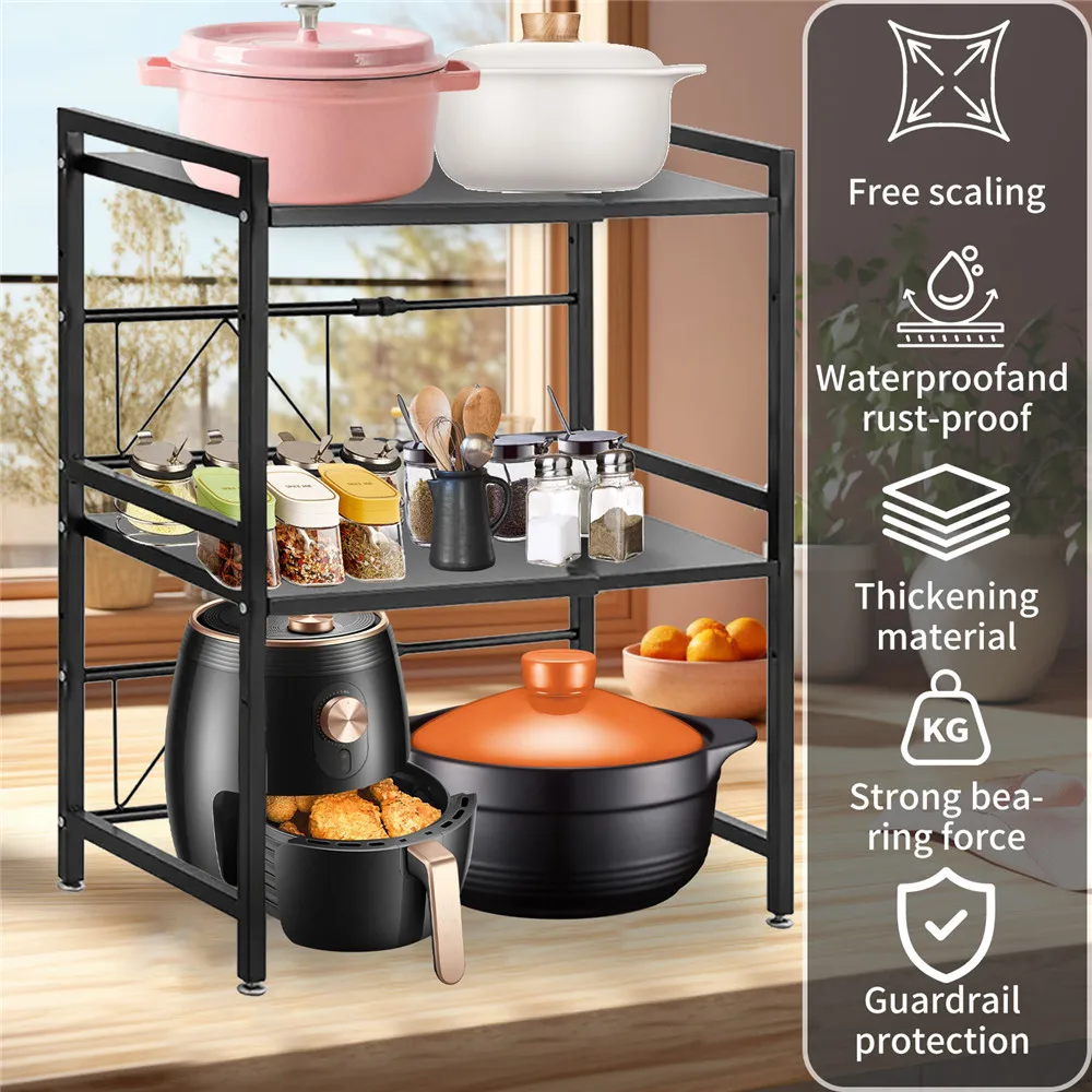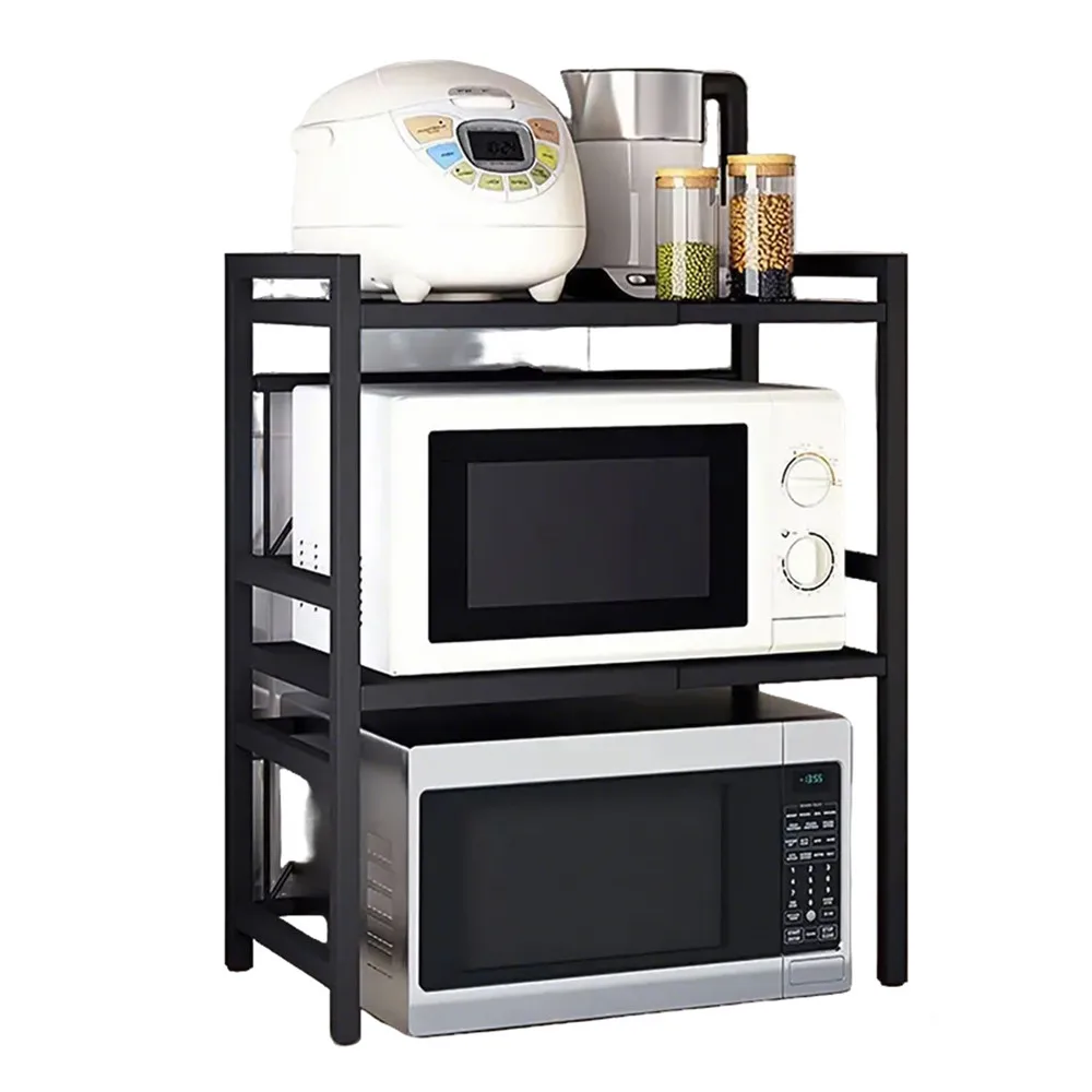 Sturdy and robust material: 3 levels. The expandable microwave shelf is made of carbon steel, is covered with a rust protection coating, the surface is smooth and easy to clean, high-strength welding technology, the sensitive welding process does not fall off easily. This ensures the stability and durability of the kitchen shelf and the load capacity can be up to 30 kg