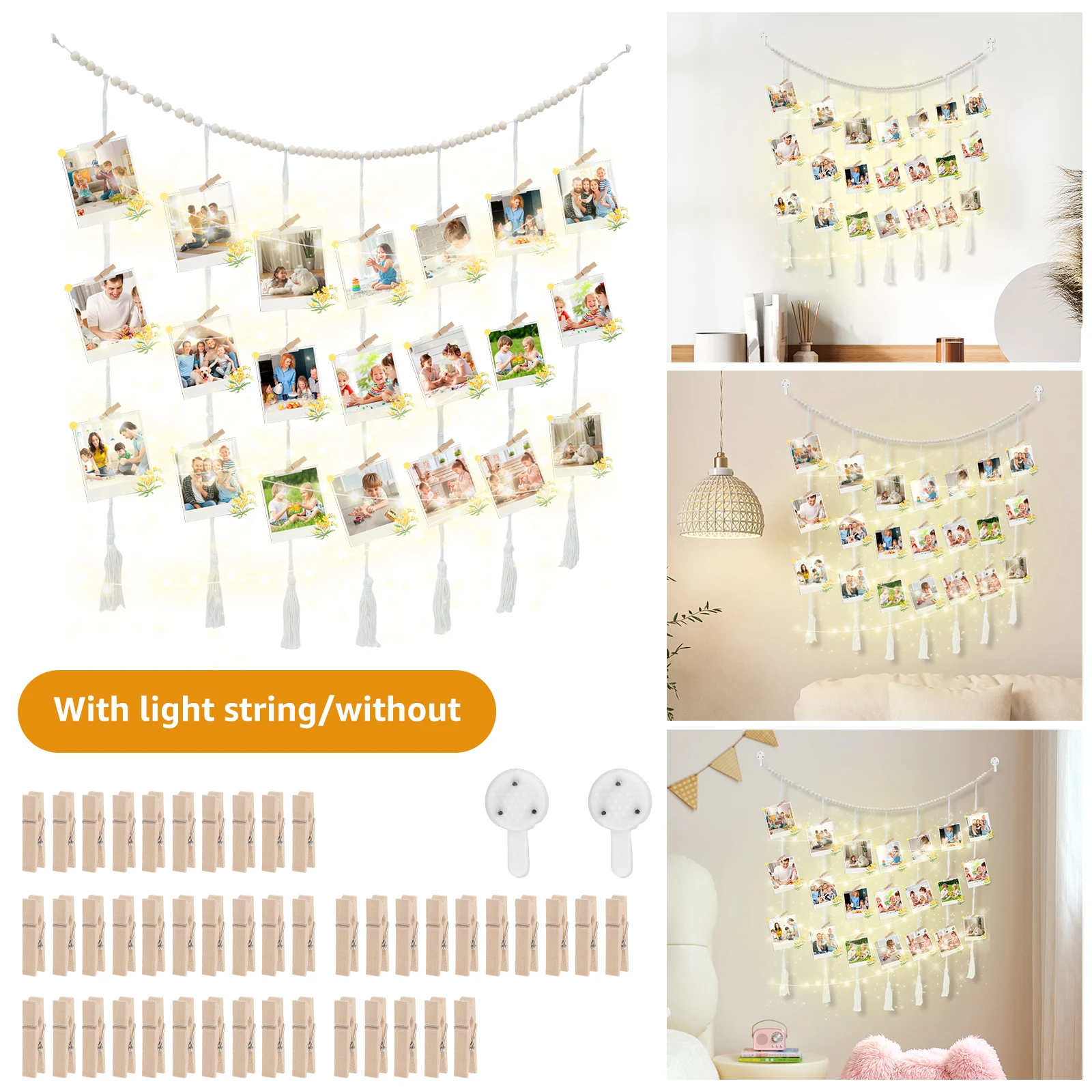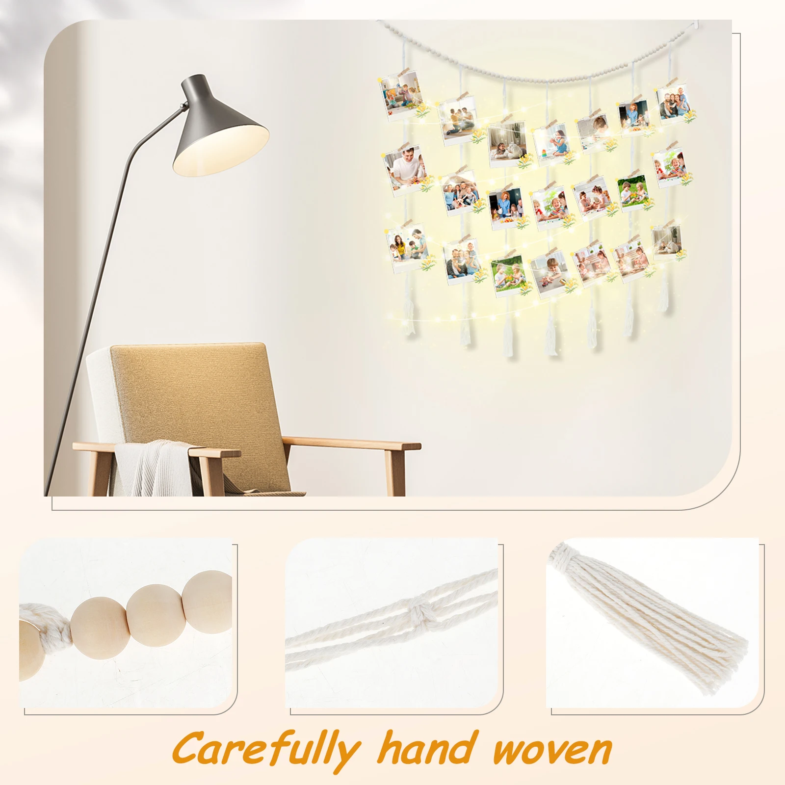 Decoración para colgar en la pared con exhibición de fotos, decoración bohemia para el hogar, cuentas de cuerda de algodón, tapiz de macramé para colgar en la pared, decoración romántica para habitación